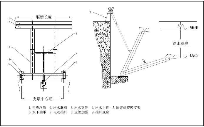 主要技术参数 滗水量100-900T/H,单推杆单边出水形式